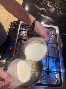 After 9 minutes your juice/butter onion mixture should be reduced by about 1/2 or more and it will be time to add the milk and heavy cream. Once you do this you again will need to stir it up real nice and then immediately turn the heat up to High. The mixture should be starting to take on the look of oyster stew at this point without the oysters.